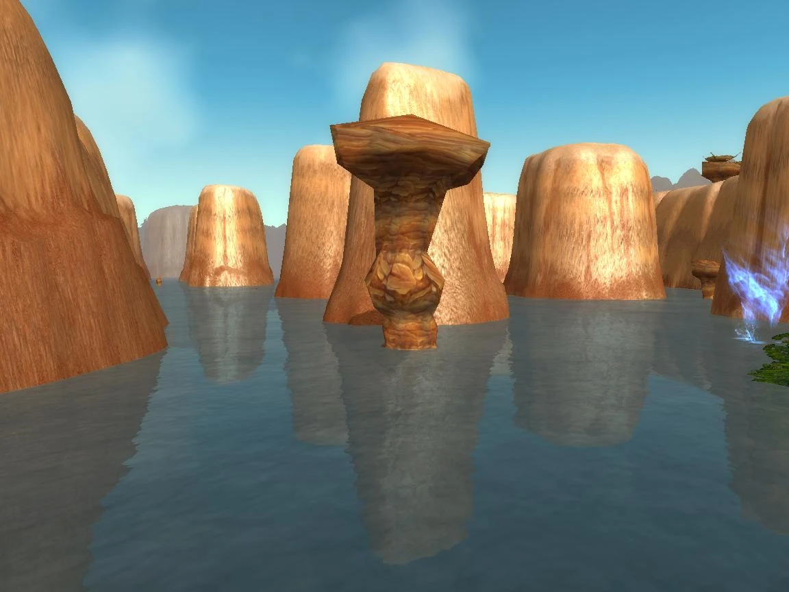 Vor der Zerstörung des Brunnen der Ewigkeit war Tausend Nadeln ein Flusscanyon, die Sandstein-Formationen hatten sich in Jahrtausenden durch das Wasser gebildet. Das Wasser floß in einen großen See im Osten - bis die Dämonen der Brennenden Legion kamen und die Welt radikal geändert wurde: Der Canyon wurde oberhalb des Wasserspiegels gerissen und trocknete aus. Er befand sich jetzt zwischen der Wüste Tanaris und dem Ödland Desolace - und bildet eine natürliche Grenze zwischen dem zentralen und südlichen Kalimdor.
