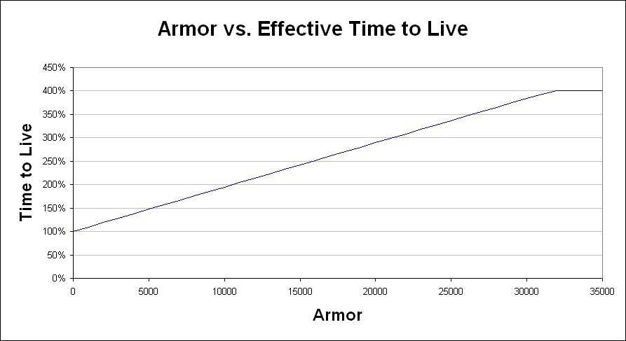 However, in terms of absolute time to live with respect to melee attacks, armor has no diminishing return effect. Given a constant melee DPS amount, each additional point of armor (whether it be from 0 to 1 or from 30000 to 30001) will increase the tank's time to live by the same effective amount. 1k additional armor increases time to live by approximately 9.47% (6.01% at level 80??), as shown by the graph. The formula for calculating time to live with respect to melee attacks is:
