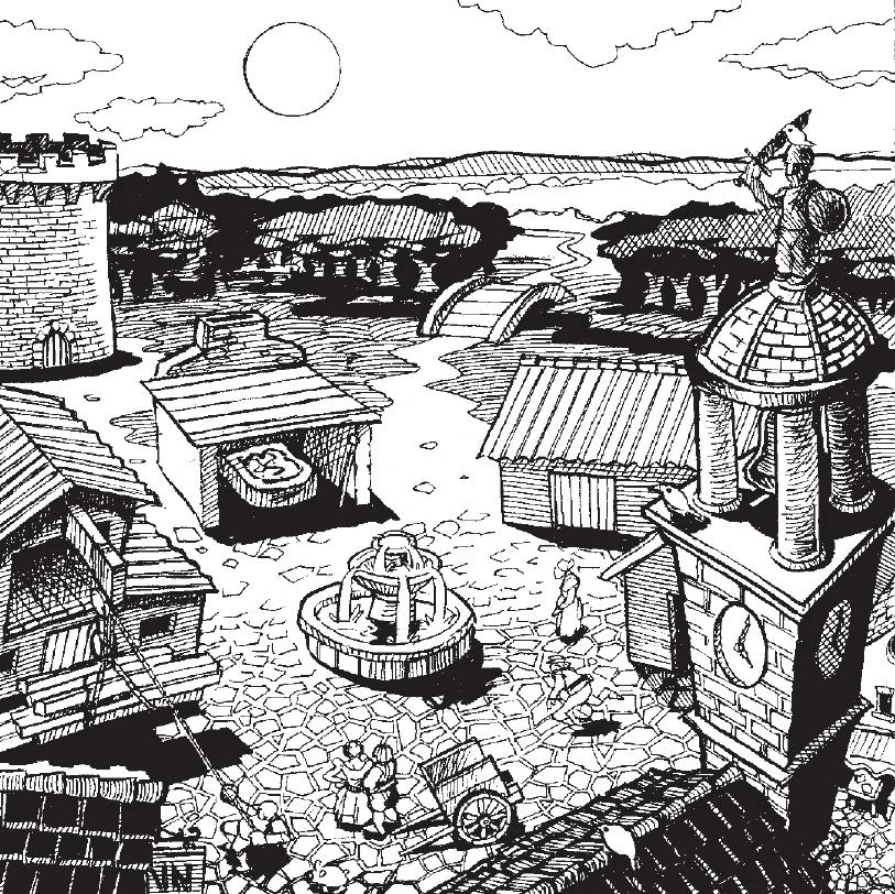 A town is not large enough to be a city, but is a gathering of several NPCs and buildings. Sometimes called a "hamlet", "village", etc.