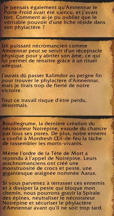 Il entama alors un rituel dans le but de ramener son maître Amnennar à la non-vie. Koristrasza qui réalisa sa faute en oubliant de détruire le phylactère, retourna dans les Souilles achever ce qu'il a débuté. Avec l'aide de héros, Noirépine et ses lieutenants furent tué avant que la Liche ne revienne parmi eux. Seulement, ils n'avaient pas prévu que la mort du nécrorateur achèverais le rituel. Surpuissant et furieux, Amnennar attaqua les assaillants, mais ses derniers parvinrent à l'éliminer de nouveaux avec l'aide du Dragon rouge Koristrasza participant au combat. Le phylactère fût cette fois-ci confié à la garde du Vol draconique rouge.[11]