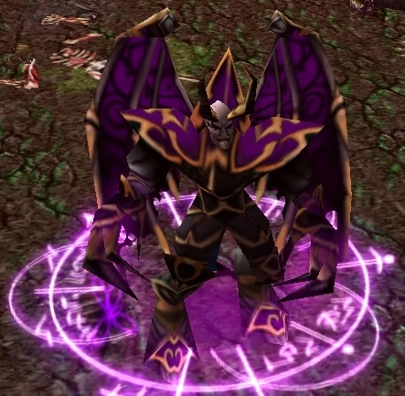 La peau de cet énorme démon est d'un violet cireux, sauf ses ailes de chauve-souris qui sont noires. Lorsqu'il soulève son énorme épée à deux mains, ses yeux pourpre se mettent à luire.