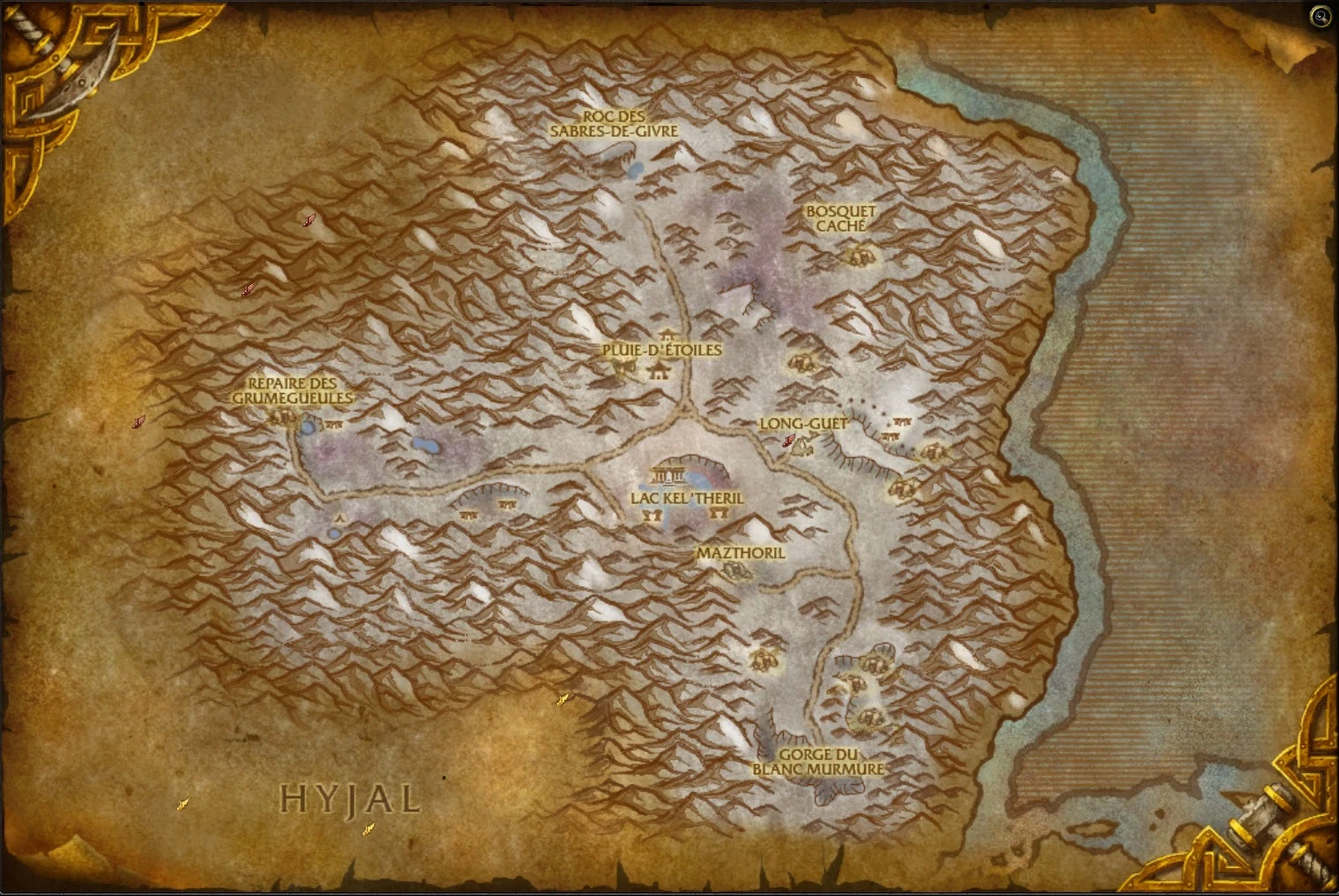 Antre de l'Horreur lunaire • Chalet Antre-des-Neiges Colline des Chardons de glace • Dun Mandarr • Émergence de Béryl Fosse de fumage de Bonrata • Fourré de l'Aîle de la chouette Gorge du Blanc murmure • Gorge du Sombre Murmure • Lac Kel'Theril Le bosquet Caché • Les ruines de Kel'Theril • Long-Guet (Le Yéti rieur) Mazthoril • Pluie-d'Etoiles • Poste des Grumegueules • Sources de Givrefeu Refuge des saisons de Ban'Thallow • Roc des Sabres-de-Givre Village des Tombe-hiver