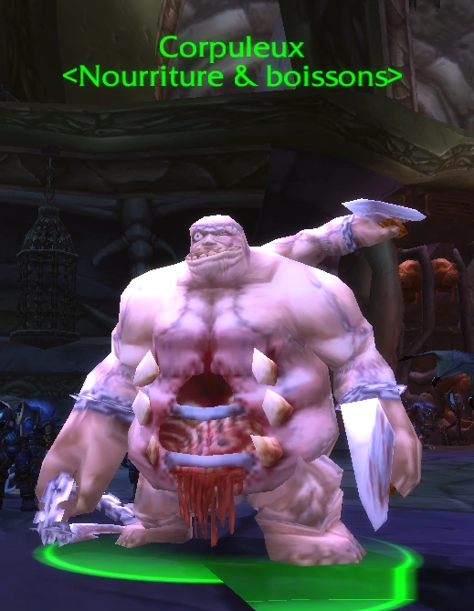 Corpuleux est une abomination appartenant a l'ordre des Chevaliers de la Lame d'ébène, c'est un ex membre du Fléau qui résista d'ailleurs a la rébellion d'Achérus : le fort d'ébène mais qui rejoint tout de même cet ordre après que le fort soit pris. Il vend maintenant de la nourriture et des boissons.