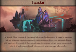 - Talador : dans l’ombre de la cité assiégée de Shattrath , les prêtres de l’âme auchenai tentent de protéger les innombrables âmes draeneï reposant dans Auchindoun d’une sombre menace démoniaque tout en garantissant la sécurité de leur peuple face à la Horde de Fer.