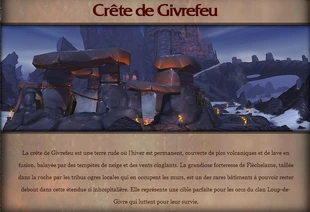 - Crête de Givrefeu : dans les étendues neigeuses surplombées par d’immenses volcans, les héros du clan Loup-de-givre et la Horde s’unissent pour repousser les envahisseurs hors de leur foyer gelé.