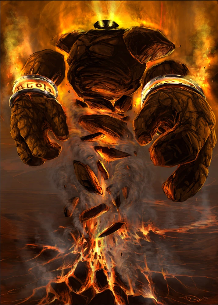 Deux orbes de lave en fusion sont situées dans le monticule de roche qui constitue la tête de cette créature, surplombant un torse rappelant une montagne. Deux immenses bandes de métal lient la créature à ce qui s'apparente à ses poignets ; si ces pierres massives peuvent être nommées bras.