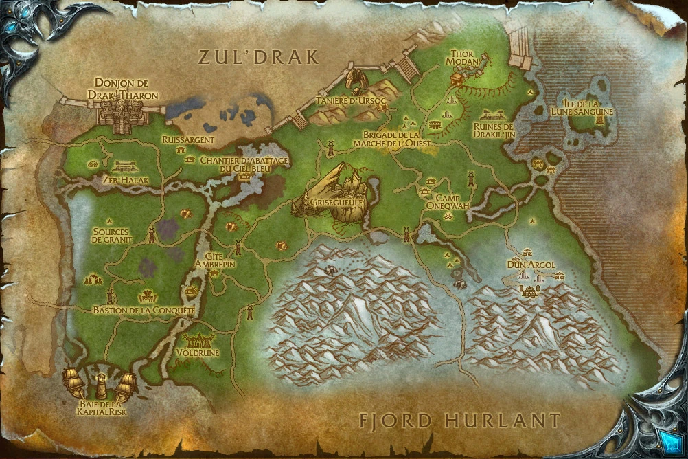 Plusieurs villes et ruines des trolls des glaces sont éparpillées dans la région, certaines attaquées par le Fléau. On peut trouver plusieurs villages de trappeurs humains qui ne sont pas affiliés à l'Alliance; en effet, ils ont été convertis au culte du loup et transformé en worgens par l'ombre d'Arugal, maintenant aux ordres du Fléau.
