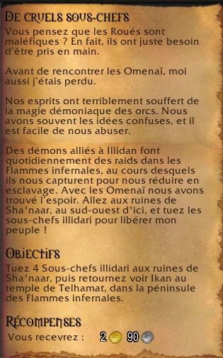 Vous pensez que les Roués sont maléfiques? En fait, ils ont juste besoin d’être pris en main. Avant de rencontrer les Omenaï, moi aussi j’étais perdu. Nos esprits ont terriblement souffert de la magie démoniaque des orcs. Nous avons souvent les idées confuses, et il est facile de nous abuser. Des démons alliés à Illidan font quotidiennement des raids dans les Flammes infernales, au cours desquels ils nous capturent pour nous réduire en esclavage. Avec les Omenaï nous avons trouvé l’espoir. Allez aux ruines de Sha'naar, au sud-ouest d'ici, et tuez les sous-chefs illidari pour libérer mon peuple!