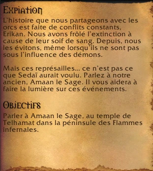 Sedaï Le frère de l’anachorète Obadeï a été retrouvé poignardé dans la plaine non loin du temple de Telhamat. Makuru vous a alors demandé de mener des représailles contre les orcs du Poste de Mag’har soupçonnés d’être les auteurs de cette assassina. Cependant, Obadeï semble déçu et contrarié par cette vengeance et vous demande d’aller parler à Amaan le Sage, au temple de Telhamat dans la péninsule des Flammes infernales.