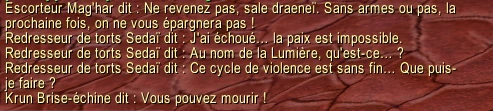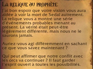 Après l’assassina de Sedaï le frère de l’anachorète Obadeï, vous est à la recherche de la vérité auprès de Amaan le sage. Ce dernier pourra révéler les événements passées par l’intermédiaire d’une relique encore active que vous avez ramené précédemment du temple de Sha’naar. Sur les lieux du drame, vous apprenez alors que Sedaï a été éconduit par les orcs du poste de Mag’haar puis poignardé par Krun Brise-échine un Gangr'orcs d’un clan adverse impliqué dans un complot.