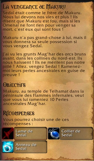 Sedaï était comme le frère de Makuru. Nous lui devons nos vies et plus! Ils disent que Makuru est fou, mais si les Omenaï ne font rien pour venger sa mort, c’est eux qui sont fous! Makuru n’a pas grand-chose à lui, mais il vous donnera sa seule possession si vous vengez Sedaï. J’ai vu les grunts Mag'har des orcs bruns avant, dans les collines du nord-est. Ils nous haïssent! Ils ne méritent pas notre pitié! Allez, vengez Sedaï! Ramenez-moi leurs perles ancestrales en guise de preuve!