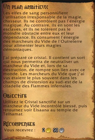 Les elfes de sang personnifient l’utilisation irresponsable de la magie. Ils ne contrôlent pas l’énergie magique. Au contraire, ils en sont les esclaves, et ils ne tolèrent pas le moindre obstacle entre eux et leur dépendance. Ils consument l’énergie des marcheurs du Vide de l’Outreterre pour alimenter leurs magies démoniaques.J’ai préparé ce cristal. Il contient un sort qui nous permettra de neutraliser un marcheur du Vide et, lors de sa destruction, de rompre son lien avec ce monde. Les marcheurs du Vide que j'ai vus étaient le plus souvent dans les champs de distorsion au sud-est de la citadelle des Flammes infernales.