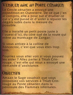Le Cercle cénarien a envoyé une expédition en Outreterre. De ce que j'en ai compris, elle a pour but d'étudier ce qui s'y est passé et d'aider à réparer les dégâts subis dans la mesure du possible. Elle a installé un petit poste juste à l'ouest d'ici, du côté sud de la route qui mène au marécage de Zangar. Si vous arrivez à la colline de Roncecroc, c'est que vous êtes trop loin.Pourriez vous aller voir si vous pouvez les aider ? Allez parler à Thiah Crin-rouge, c'est elle qui nous a envoyé une demande d'assistance.