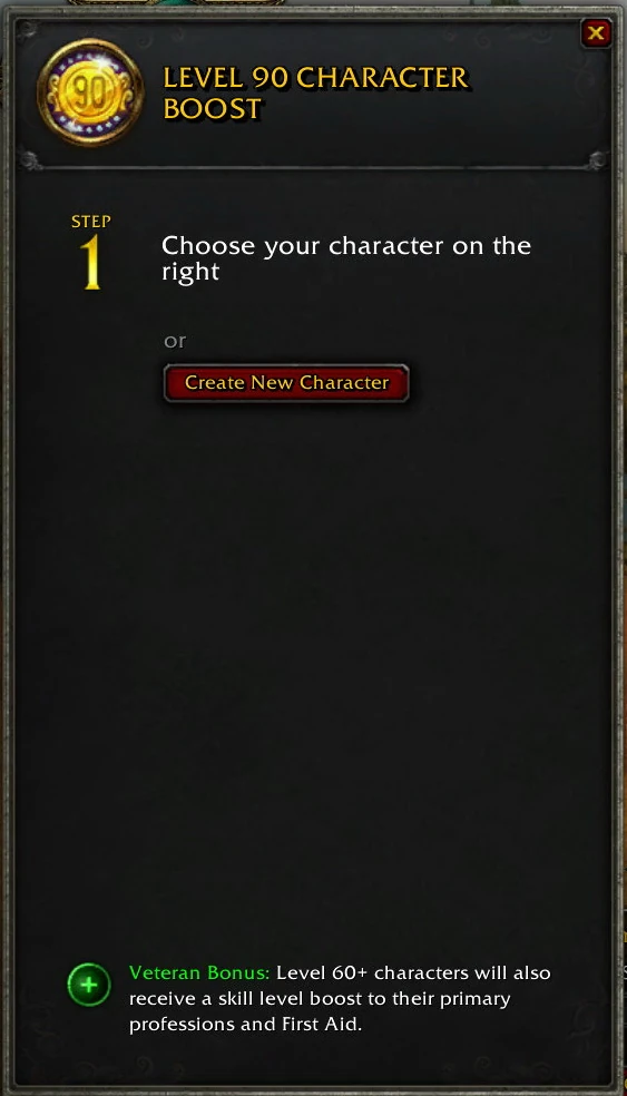 Egy level 90 ikon jelenik meg a karakterválasztó menüben, közvetlen a szerver neve mellett (persze csak ha elérhető ez a funkció a játékos számára). Amint a játékos rákattint erre az ikonra elkezdődnek a Karakter Boost lépései...