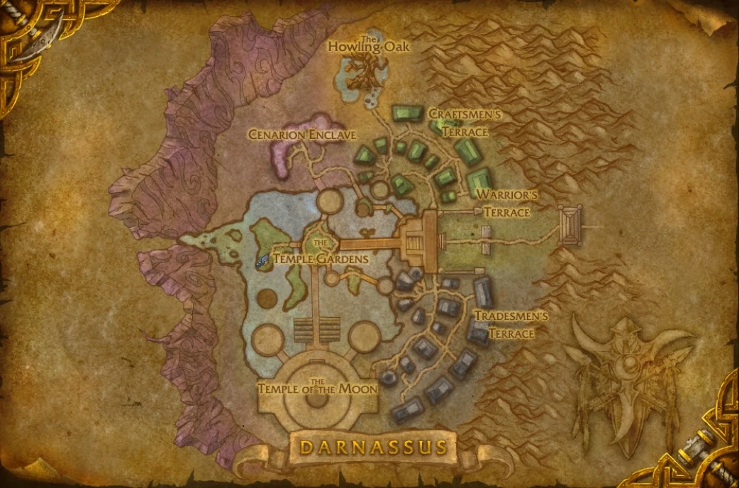 Darnassus jest rozmieszczony na tarasach od północnej, wschodniej i południowej strony centralnej części jeziora.