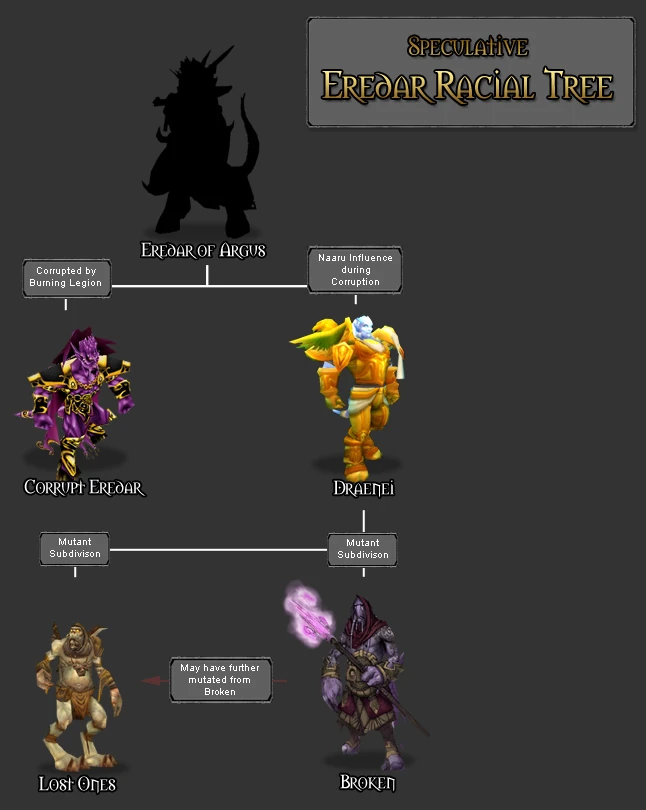 Dokładna historia rasy eredarów nie jest znana. Niektórzy uważają, że Zagubieni i Złamani oderwali się bezpośrednio od draenei na skutek pewnych zawirowań historycznych.