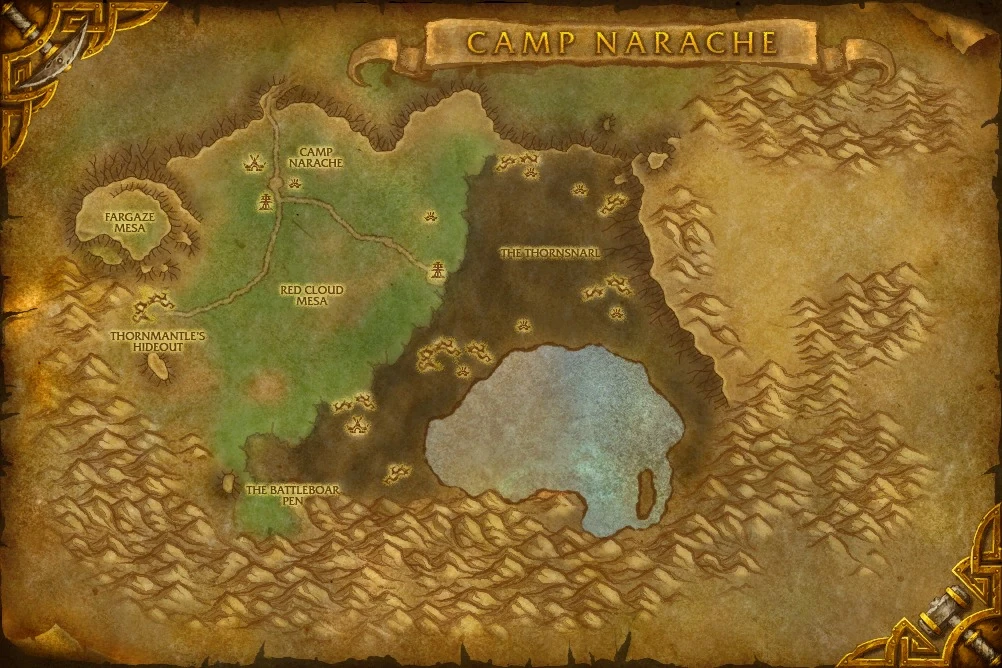 Obóz Narache jest startowym miejscem oraz miastem Taurenów, znajdujym się w południowym Mulgore przy północnej krawędzi Płaskowyżu Czerwonej Chmury. Taureńscy Szamani znajdą tutaj swoje pierwsze zadanie na totem (Totem Ziemi). Obóz Narache jest główną wioską plemienia Jastrzębiego Oddechu, którego Wódz to Hawkwind. Znajduje się tam 5 budynków: główny namiot (gdzie urzęduje Wódz Hawkwind), duchowy hall (z trenerami druidów oraz szamanów), namiot-piekarnia, namiot-zbrojownia i pojedynczy namiot, gdzie stoją handlarze sprzedający zwykłe rzeczy.