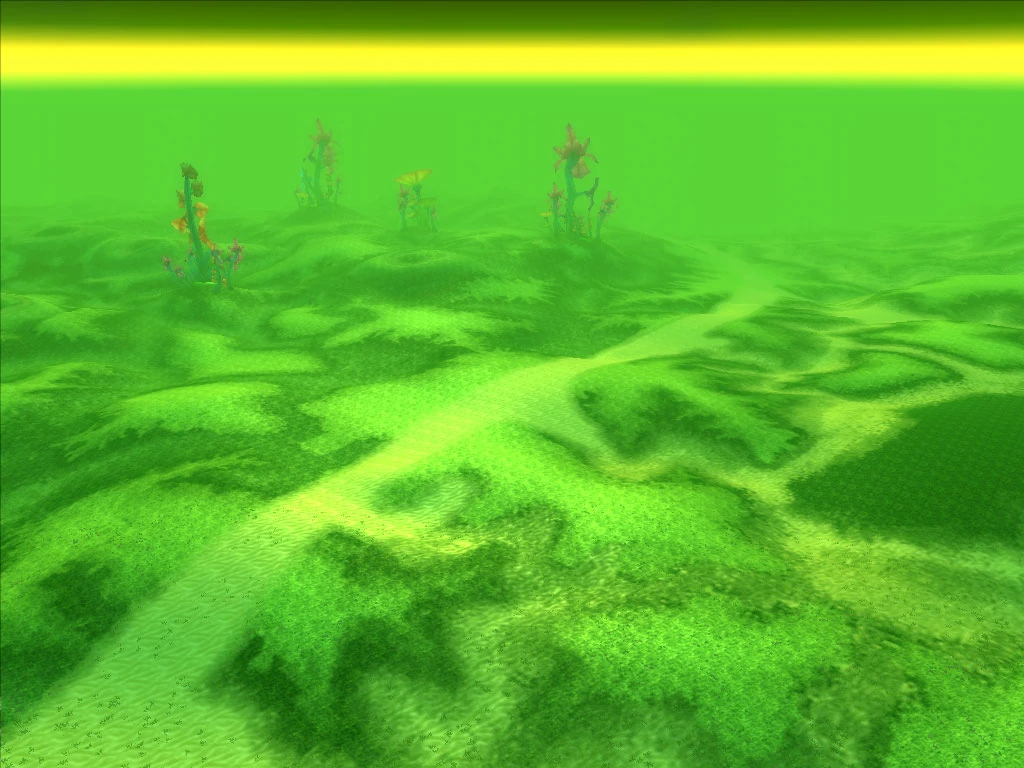 Tekstura terenu jest bardzo rażąca, jest to ostra zieleń, uzupełniona trawą(niewidoczna na zdjęciach, robione z wysoka). Ciemnozielone drzewa, których korzenie wiszą w powietrzu trzymając fontanny są główną ozdobą, oprócz nich można tam dostrzec łuki przypominające Elfickie i posąg od pasa w górę wyrastający z ziemi.