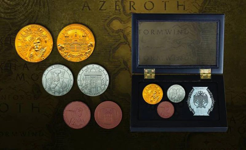 Monety, jakimi posługuje się Przymierze ma następujący podział: złota moneta na awersie ma wizerunek Wielkiego Króla Variana Wrynna, zaś na rewersie bramę Wichrogrodu; srebrna przedstawia z przodu króla Magniego Miedziobrodego, zaś z tyłu wrota Żelaznej Kuźni, natomiast miedziana moneta ma wizerunek Wysokiej Kapłanki Tyrande Whisperwind na awersie, zaś na rewersie - Świątynię Elune w Darnassusie, stolicy Nocnych Elfów. Druga strona - Horda - ma w taki sposób przedstawione monety: złote ukazują na awersie Wodza Wojennego Thralla, a na rewersie wrota do Orgrimmaru; srebrna przedstawia Mroczną Panią Sylvanas Windrunner, zaś po drugiej stronie główne wejście do Podmiasta, natomiast miedziana ma wizerunek Cairne'a Bloodhoofa z przodu i totemy Gromowych Urwisk z tyłu.