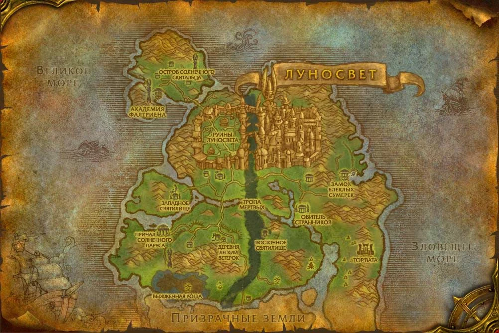 Зона известная как Руины Луносвета, составляет западную половину Луносвета, столицы эльфов крови и бывшего Королевства Кель'Талас. Они разделяются реконструированными восточными участками Луносвета из-за Тропы Мёртвых - которой прошел Артас Менетил и Плеть на их пути к Солнечному Колодцу для воскрешения некроманта Кел'Тузада. Когда они пересекли Кель'Талас по приказу натрезима Тихондрия, Артас и его воины разрушили всё на своем пути. Плеть ворвалась через врата Кель'Таласа защищавшие Луносвет от напавших и уничтожила Таллассийский корпус следопытов, во главе с Сильваной Ветрокрылой, прежде чем наконец-то достичь Плато Солнечного Колодца и поместить гниющий труп Кел'Тузада в магические воды Солнечного Колодца. Кел'Тузад был воскрешен как могущественный Лич, в то время как колодец был навсегда испорчен.