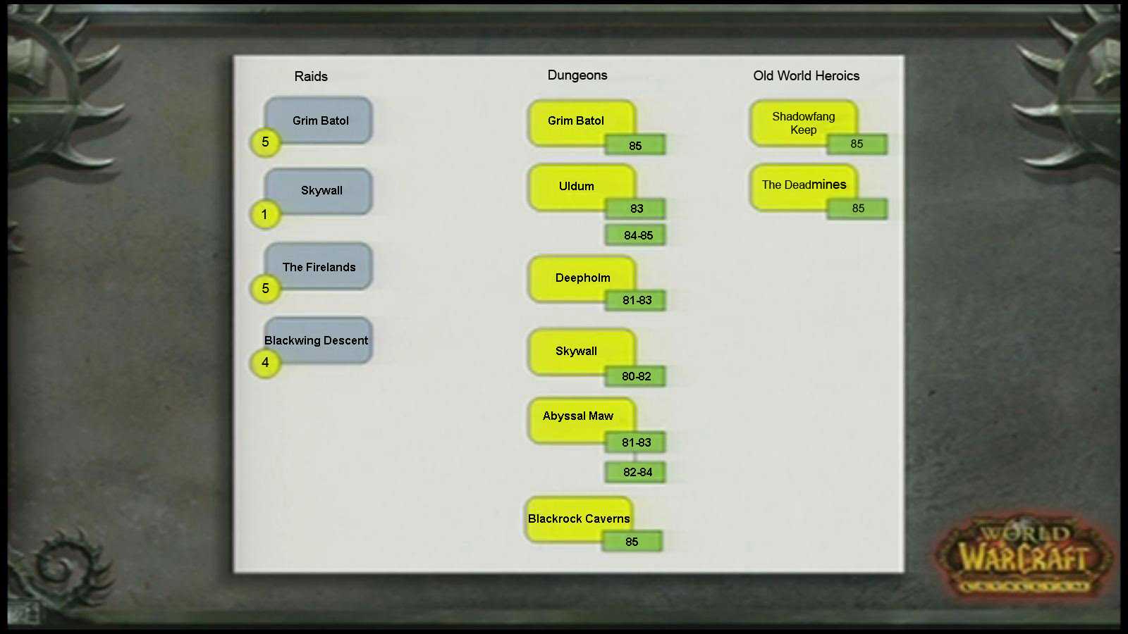 - Грим Батол — новое подземелье для игроков 85-го уровня, расположенное на горе, что на границе между Болотиной и Сумеречным нагорьем по координатам [19, 54], представляющее из себя древний город дворфов, теперь используемый Смертокрылом.